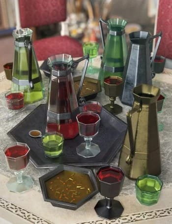 テーブルに並べる飲み物のセット。液体の色が変えられるマテリアル付き