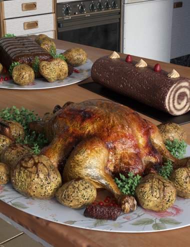 チョコレートユールログ、ローストビーフ、七面鳥、クリスマシーン用のグレービーソースを含む3つの無料の小道具のセット