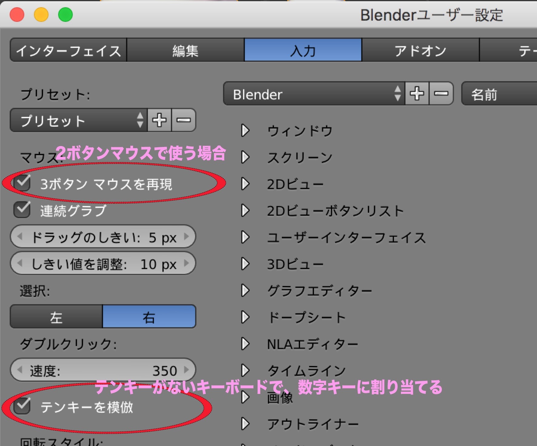 Blenderは3ボタンマウスを想定してるので、MagicMouseだと使えないものが出てくるので、「3ボタンマウスを再現」にチェックをいれる。