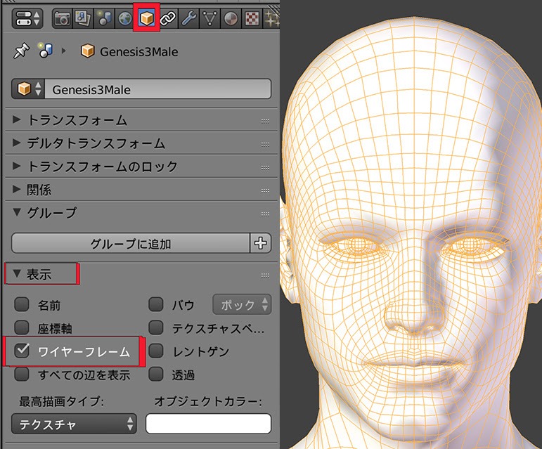 対象を選択して表示されるオブジェクトのタブ内「表示>ワイヤーフレーム」にチェックを入れる。