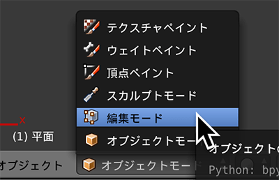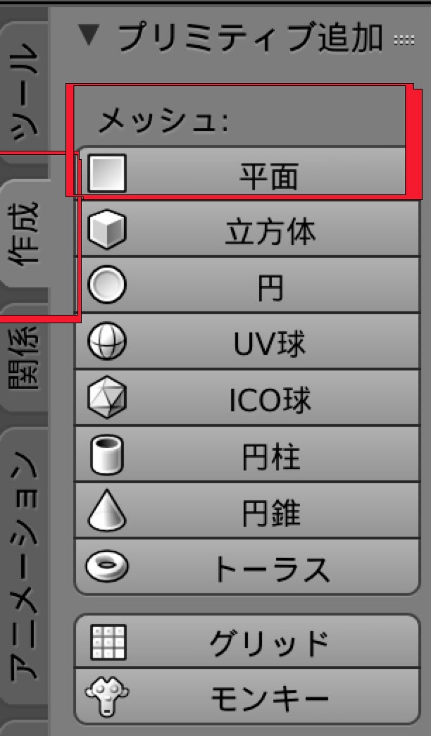 左のタブから「作成>プリミティブ追加>メッシュ」の一番上の平面を呼び出す。
