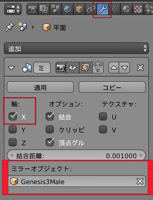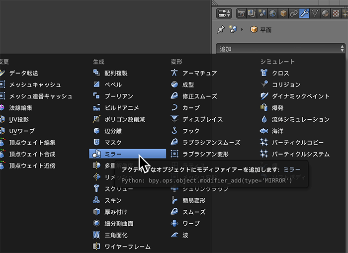 オブジェクトモードに戻し、今作った四角を選択した状態で、スパナ印のタブから「ミラー」を選択