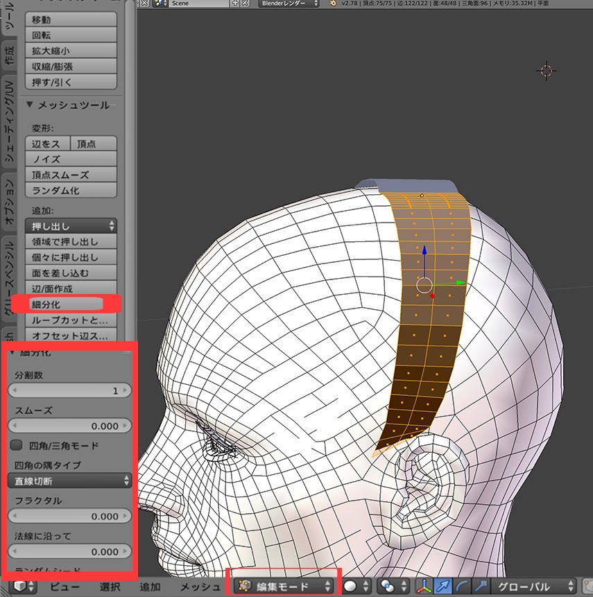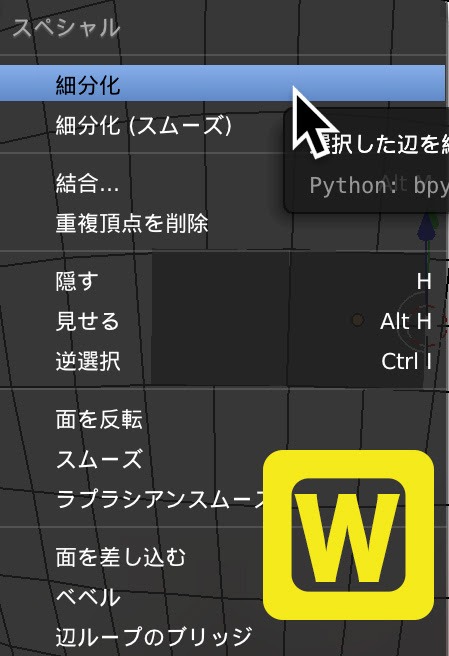 「W」キーを押すとこういうウィンドウが立ち上がるので「細分化」を選択