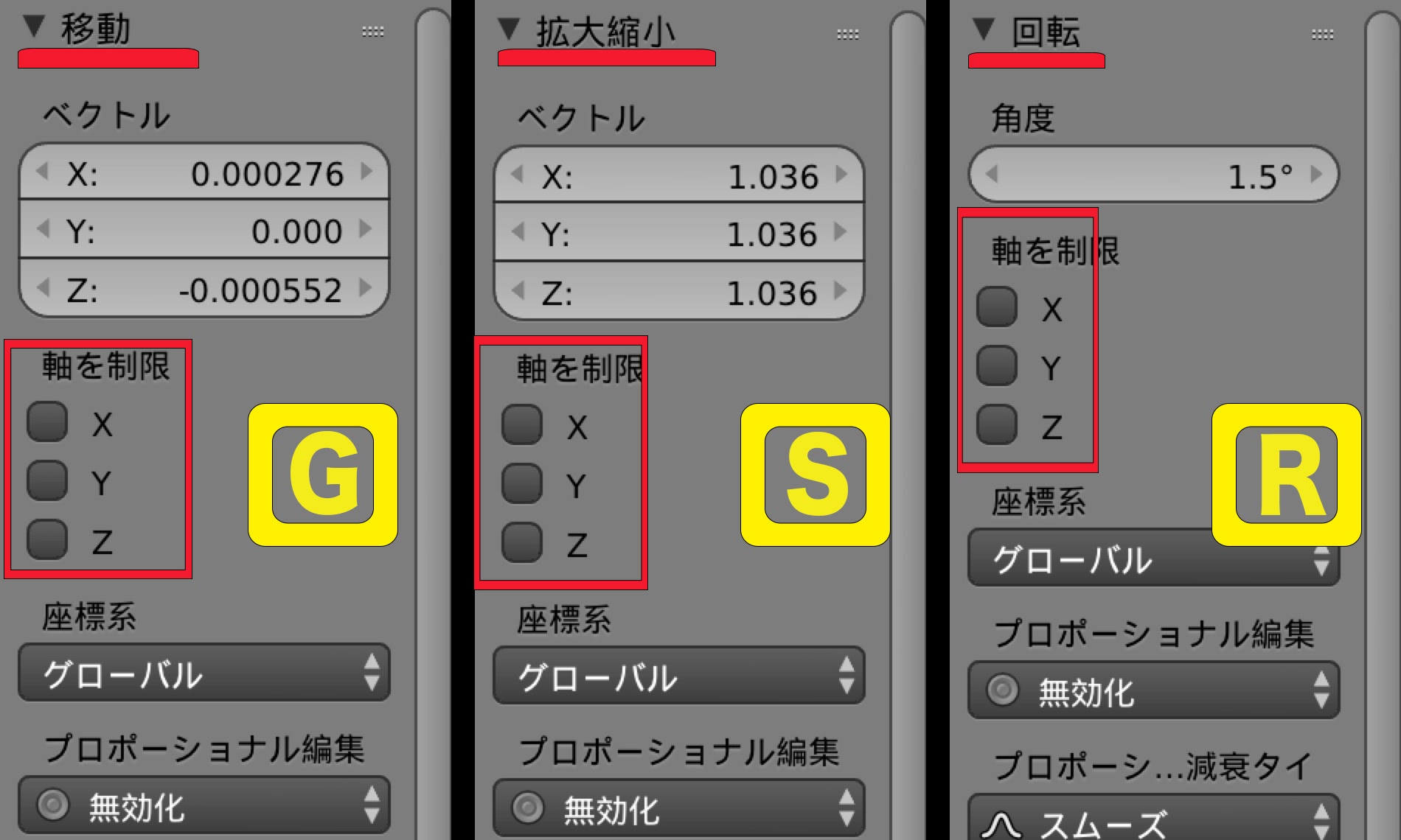 この「軸を制限」がなんかどれも効かなかったので、軸方向ごとに動かしたいときは「ベクトル」のところで左右に動かした方が簡単だった。