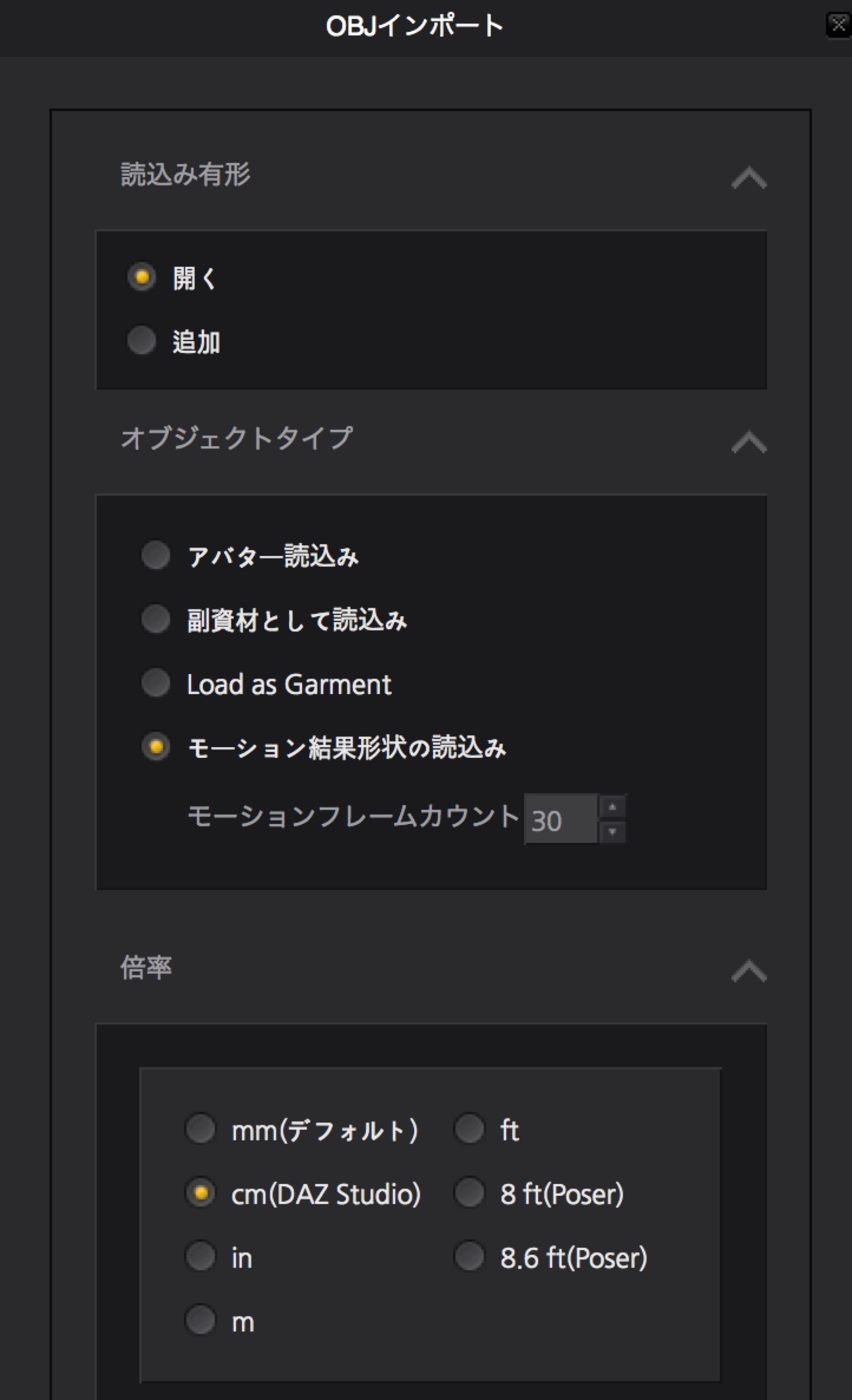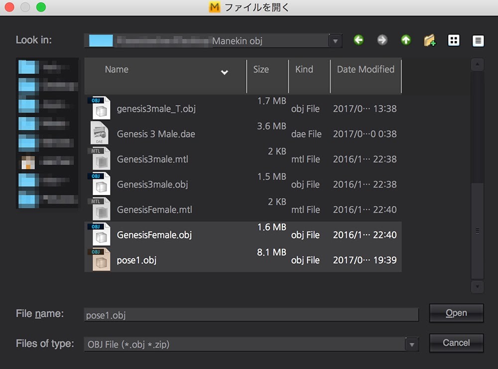 ファイルの選択ウィンドウが開くので、Daz Studioで書き出しておいたポーズファイルを選ぶ。
