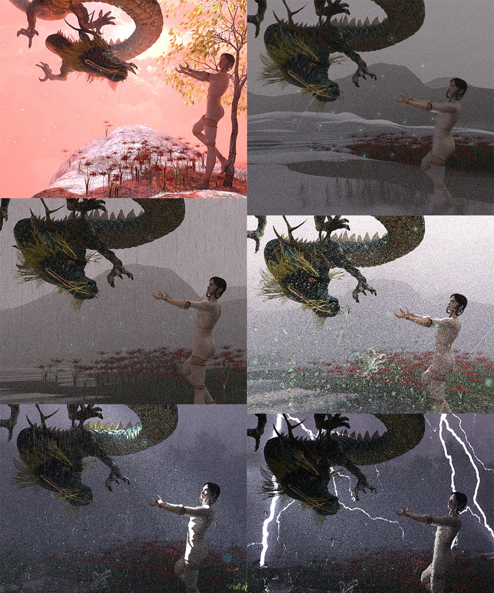 実は以下の画像より前には蝶や桜などと戯れる構図を考えていたんだけど、途中で「そういや以前作成したまま埋もれてるEastern Dragonがどっかにあったな」と引っ張り出し、そこから徐々に変わり始めた。