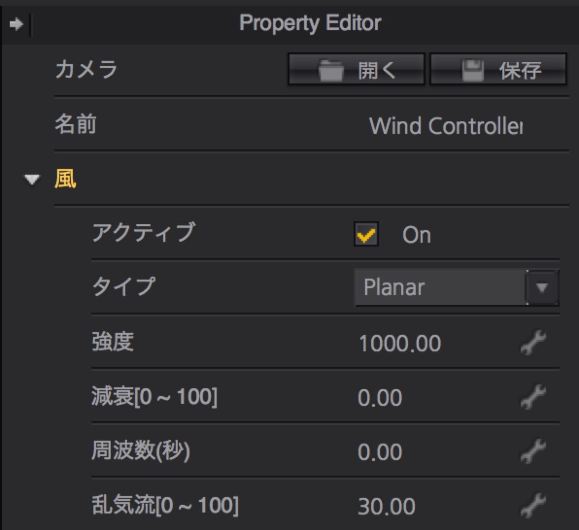 プロパティエディタの方で、風の強さやランダムな気流なども調整できる。