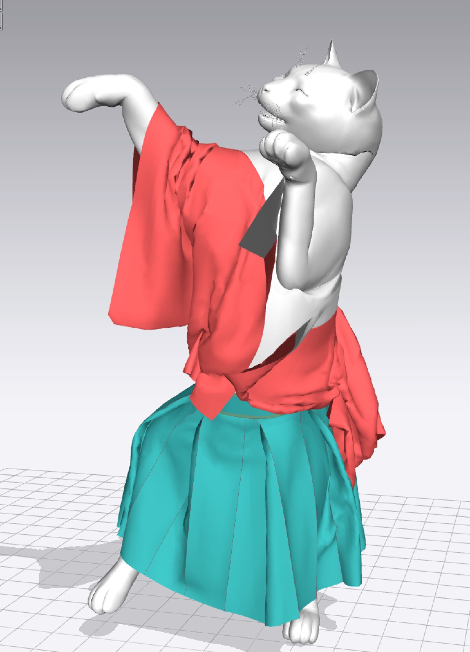 帯つきバージョンもやろうとしたが、袂と着物とが干渉しまくりで何度も3D画面シュミレーション開始の位置を調整してもぐっちゃぐちゃになるのであきらめた。やるならシュミレーションしないで別ポリで固定させて作るべきだろう。