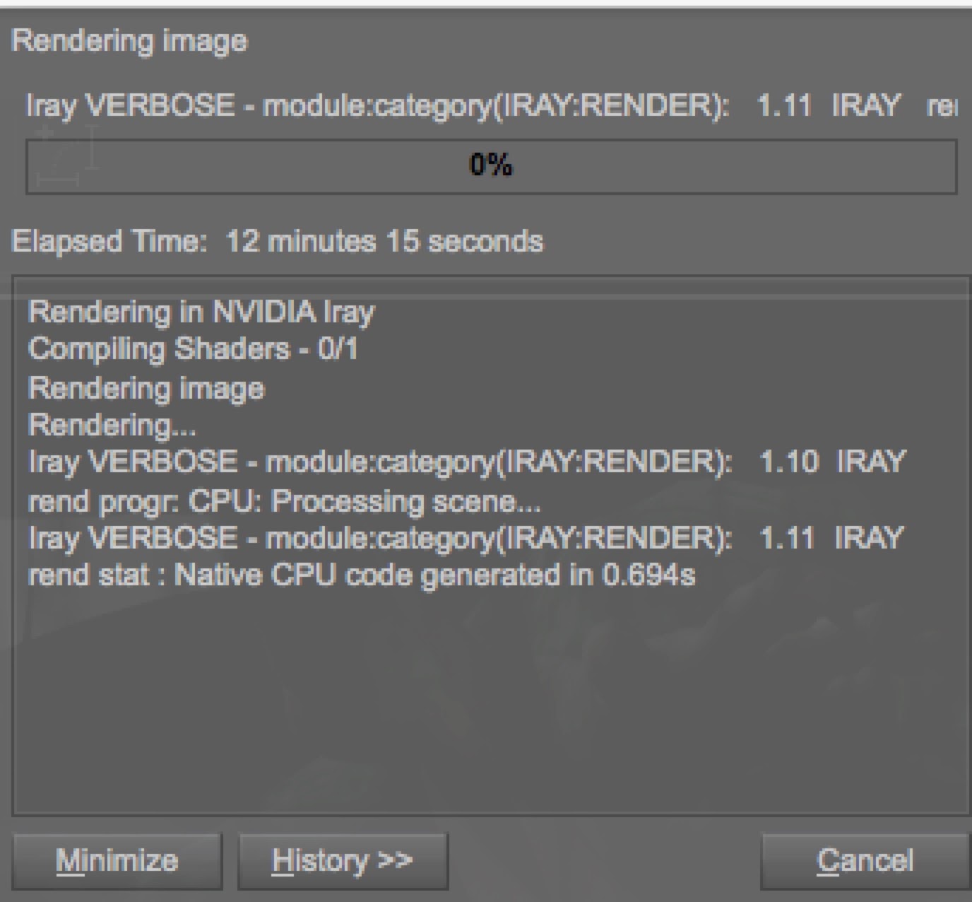 テストレンダを繰り返し、ライトや位置やレンダリング設定などを徐々に煮詰めていって「よし、この設定で最後までいくぞ!最終レンダリング開始!」と思ったら、上記の画面で止まって10分経っても20分経っても1ドットもレンダリングが始まらない。