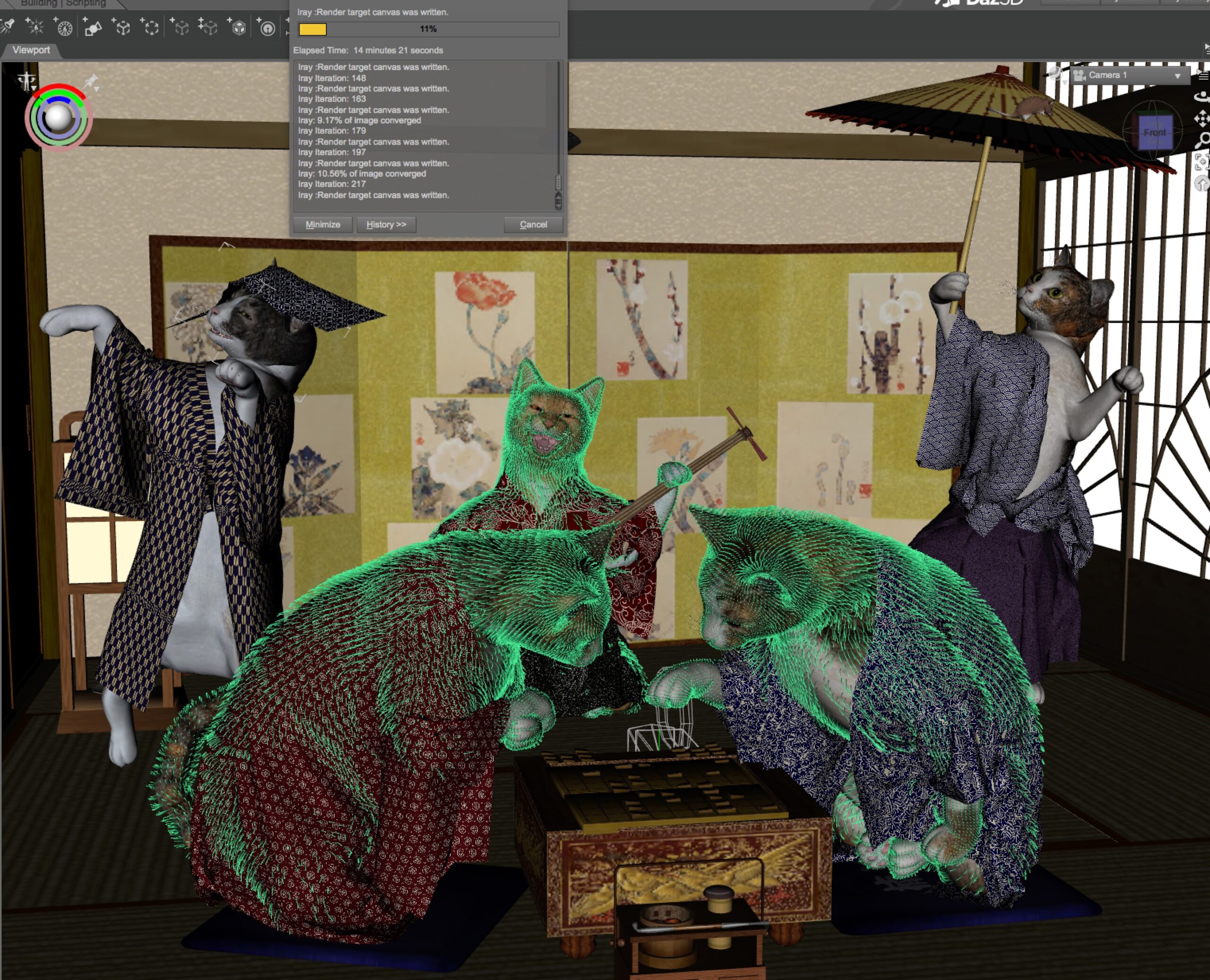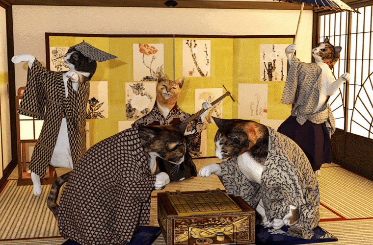 幸いポーズをつけて衣装をつけて、小道具をもたせマテリアル設定した個々のにゃんこが保存してあったので(やっといてよかった)、お部屋をHoneyさんの二階座敷から1部屋だけの数奇屋座敷-華に変更して再配置。