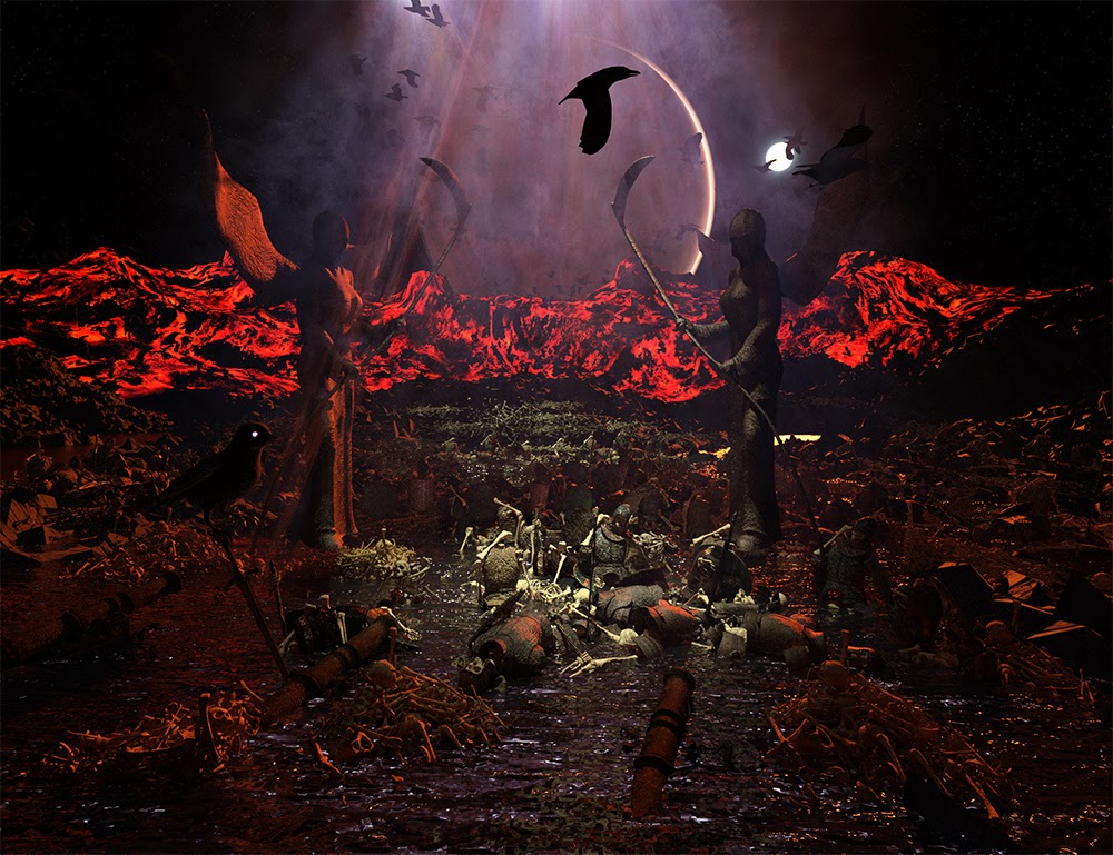 背景も砂漠にしたり岩石の荒野にしたりマテリアルを変えていたが、最終的に溶岩の溢れる地獄絵図にしました。本来terradome3の「水面」マテリアルであったのをコピーして大地の方に適用してパラメーターを調整しなおしました。