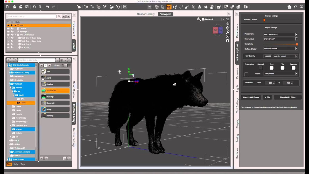 ざざっと説明すると、まずファー付きの動物を読み込んでポーズをつけ、上部のwindowメニューから Panes(Tab) > Look at my Hair でタブウィンドウを開く。