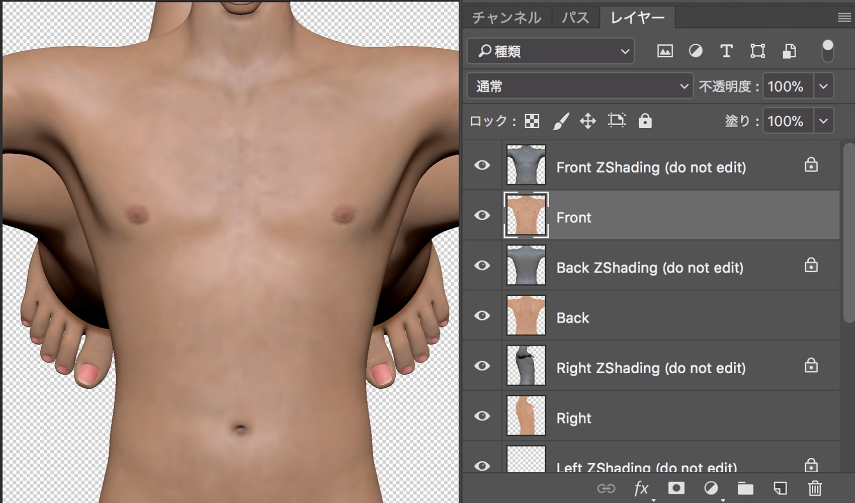 h.パラパラパラーっと各カメラ方向からの出力があり、Photoshopでは複数レイヤーが重なってインポートされてるので、修正したいレイヤーごとに表示、非表示で手直しする。終わったらそのまま上書き保存でまとめてシングルの時と同じ手順でZbrushに転送される。