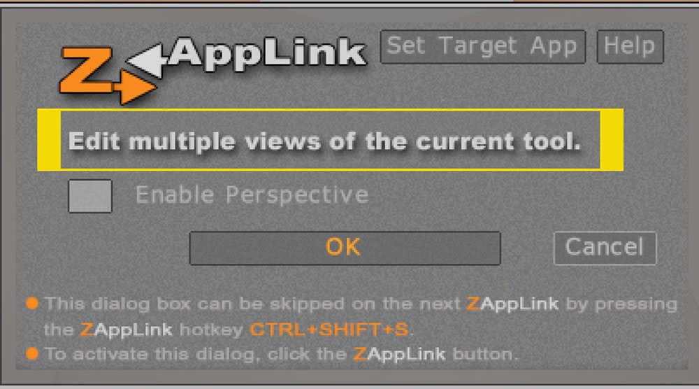 g.ここまでやったところで「ZAppLink」のボタンを押すと、マルチビューモードになってるという表示が出る。その下はパースペクティブを効かせた状態で出力するかのチェックなので、通常のテクスチャ修正には不要。