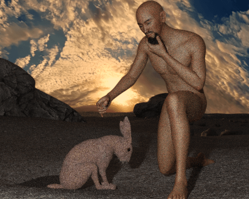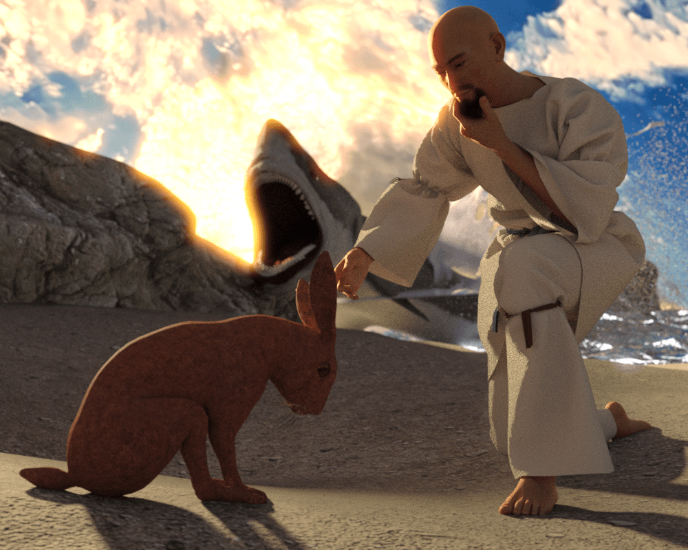 貧相な裸のおやじが兎と浜辺で戯れるシュールな状態でテストレンダを繰り返して調整していく。