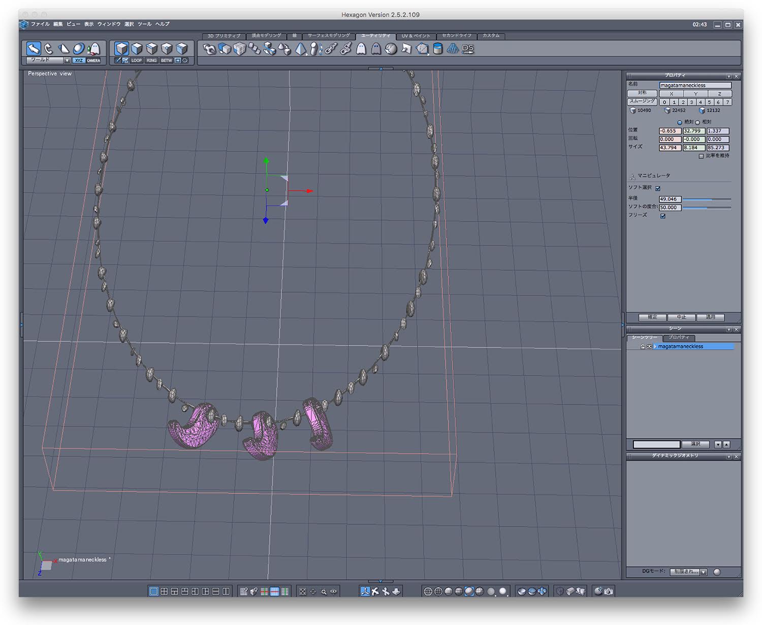 これをHexagonに取り込んでdecimateをかけてみたら、偶然なんかちょうど良い感じに石をつなげたような感じになったので、ここに勾玉の形状をとりつける。