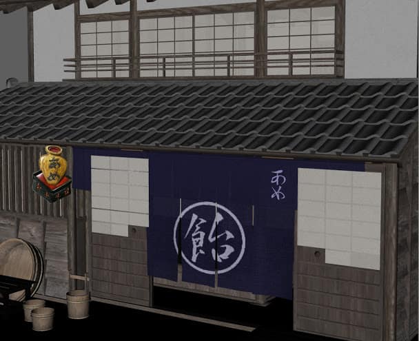店舗なので呉服屋や味噌屋や薬屋などでやってみたが、基本内部が見えるオープンタイプだったので、閉まってる感じがよいなあと、結局sugatakさんの「Old Japanese Town Edo Vol.5の」中から旅籠のひとつを暖簾テクスチャを変更して看板などもつけてみた。