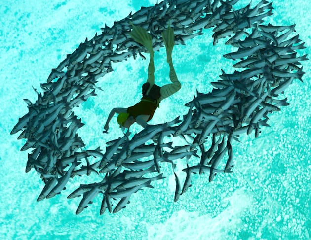 ってなわけで、よく水族館やネイチャードキュメントで見るイワシの大群みたいなの表現できないかな〜と。