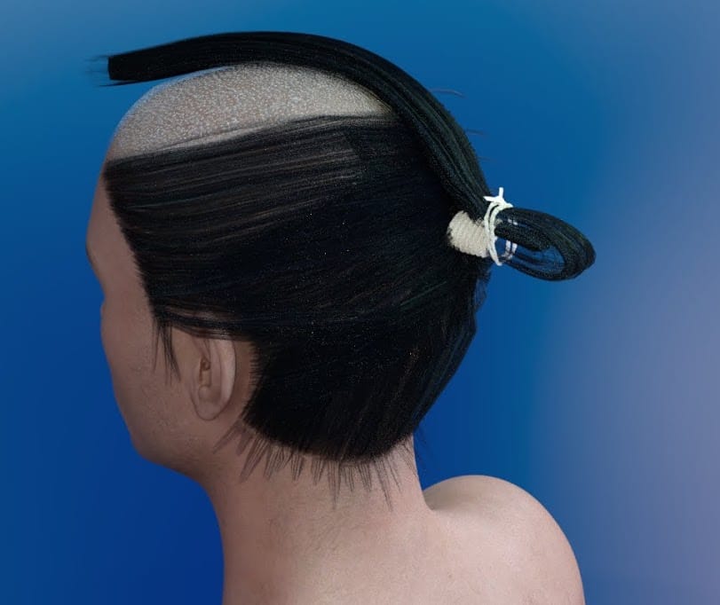 戦場で傘かぶったり脱いだり、暴れて乱れたりするでしょ?。元結が切れた落ち武者ヘアになる手前の乱れた丁髷をやってみたくてw