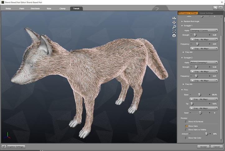 タブの一番右の「Tweak」ではスタイルで形作った毛流れが確認でき、さらに右側のスライダーで毛束の調整やランダムな感じにできる。