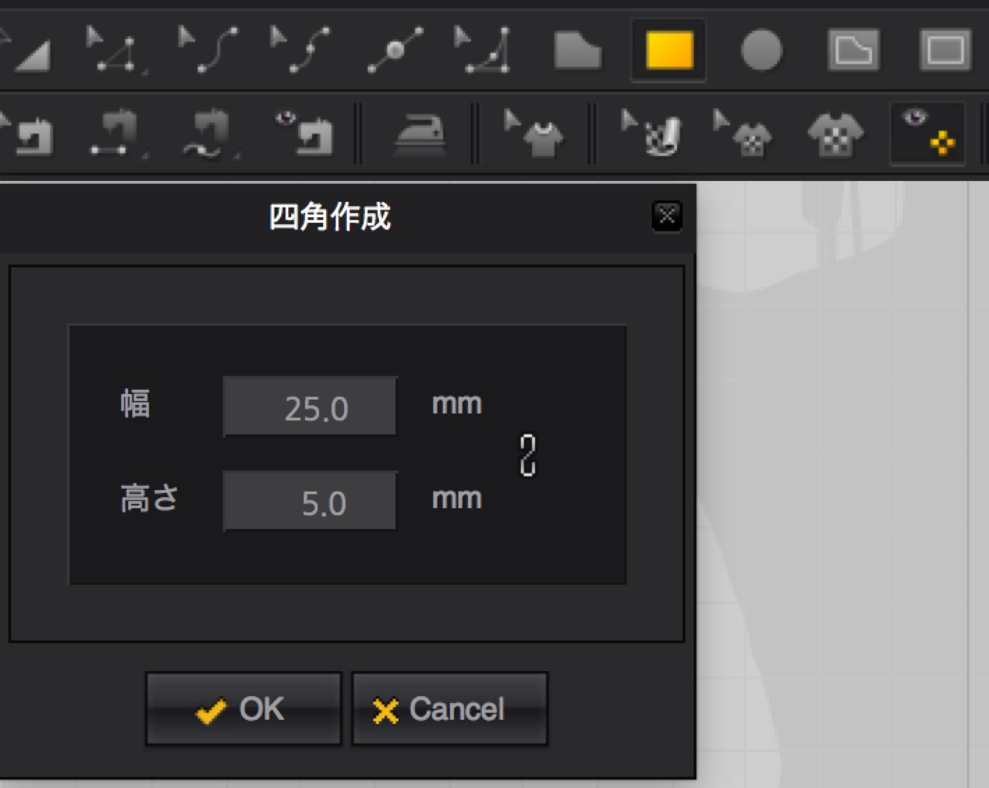 長方形作成を選択後、左クリックで四角作成ウィンドウが出るので幅と高さを指定する