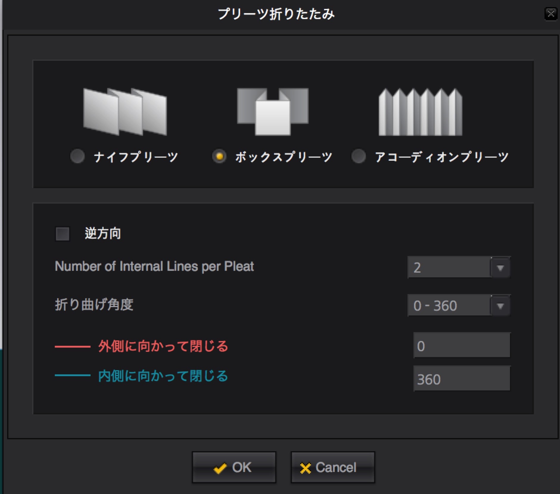 「プリーツ折り畳みツール」で、折りたたみ方を指定する