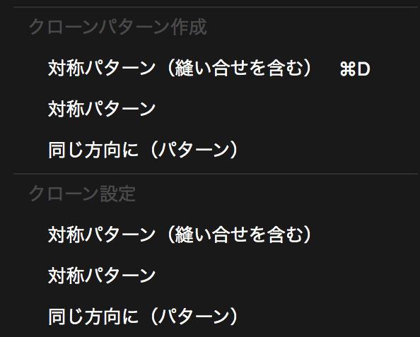 クローン設定の中から、複数のパーツの場合は縫い合わせも含むか、縫い合わせしない状態での複製か、逆向きにしない同じ形状か状況によって選択する。