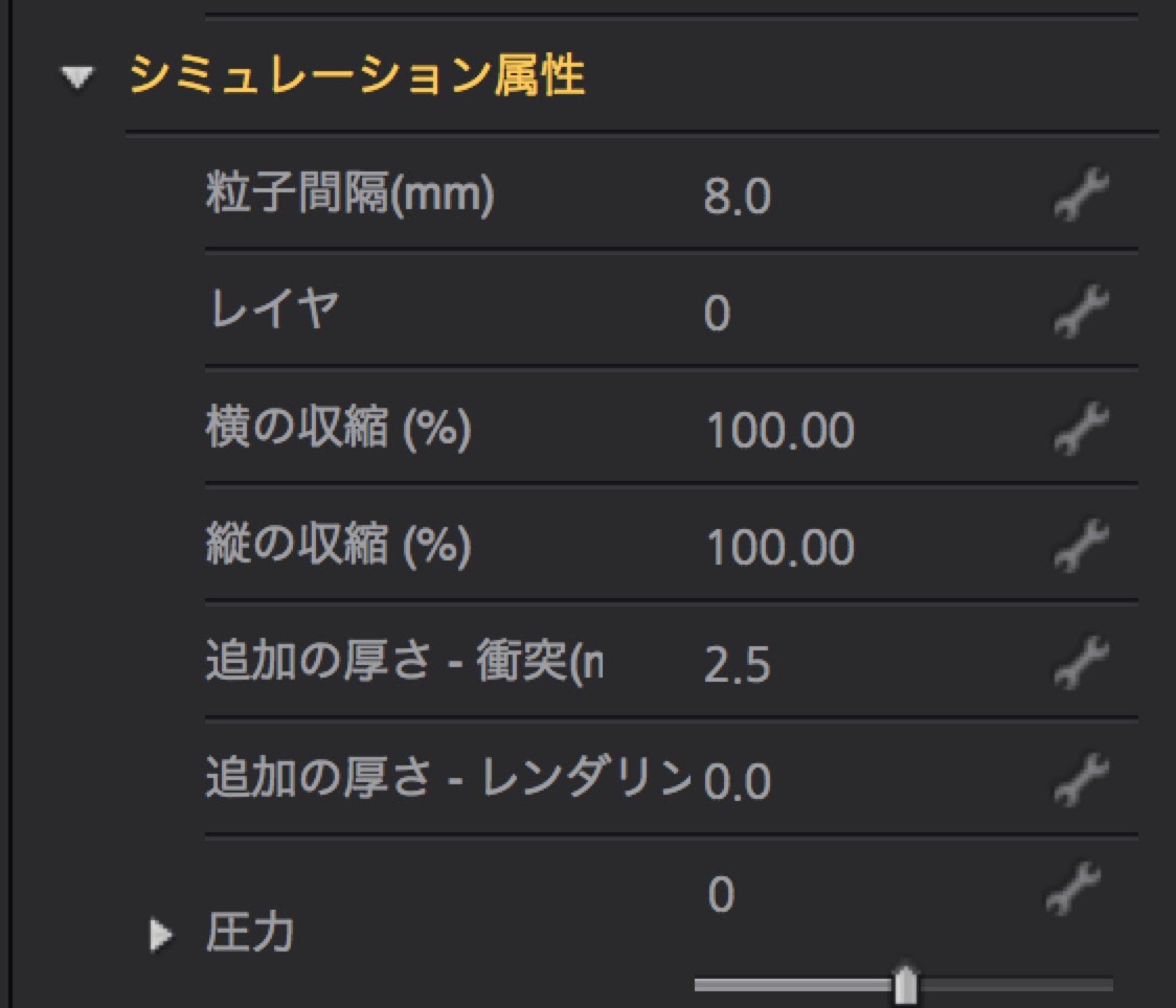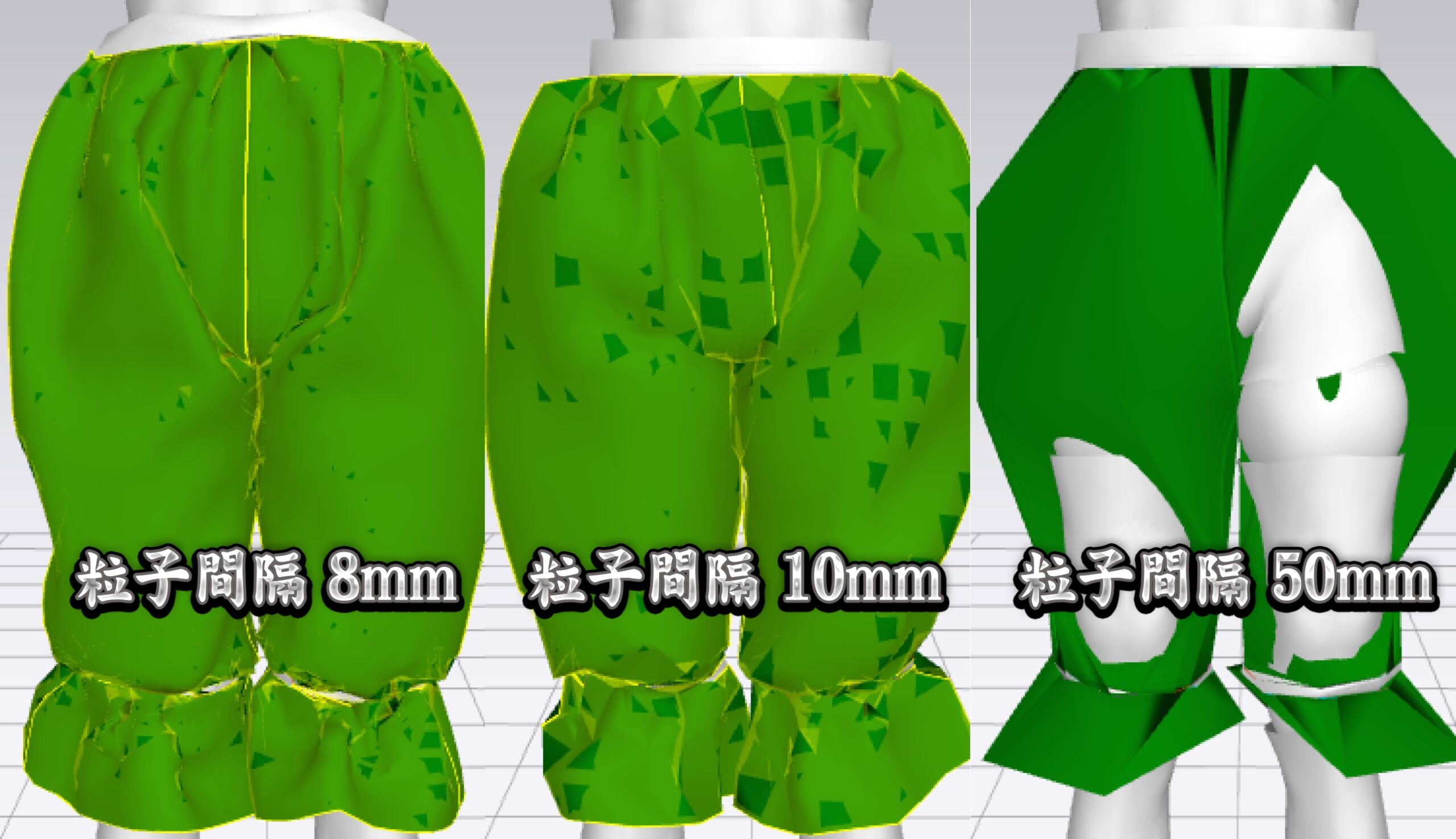 該当するパターンを選択し、プロパティエディタの中の「シュミレーション属性」のタブ内一番上、<粒子間隔(mm)>の数値を変える。数値が小さい方が細かくなるようだ。