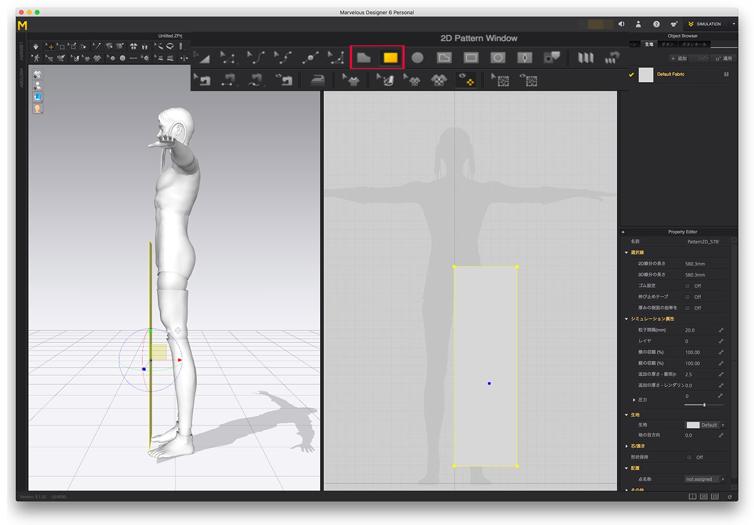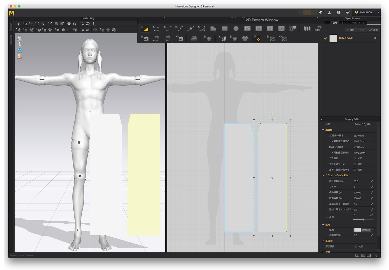 右側のパターンウィンドウで、型紙の作成や縫い合わせ等実際に服を作成していく。