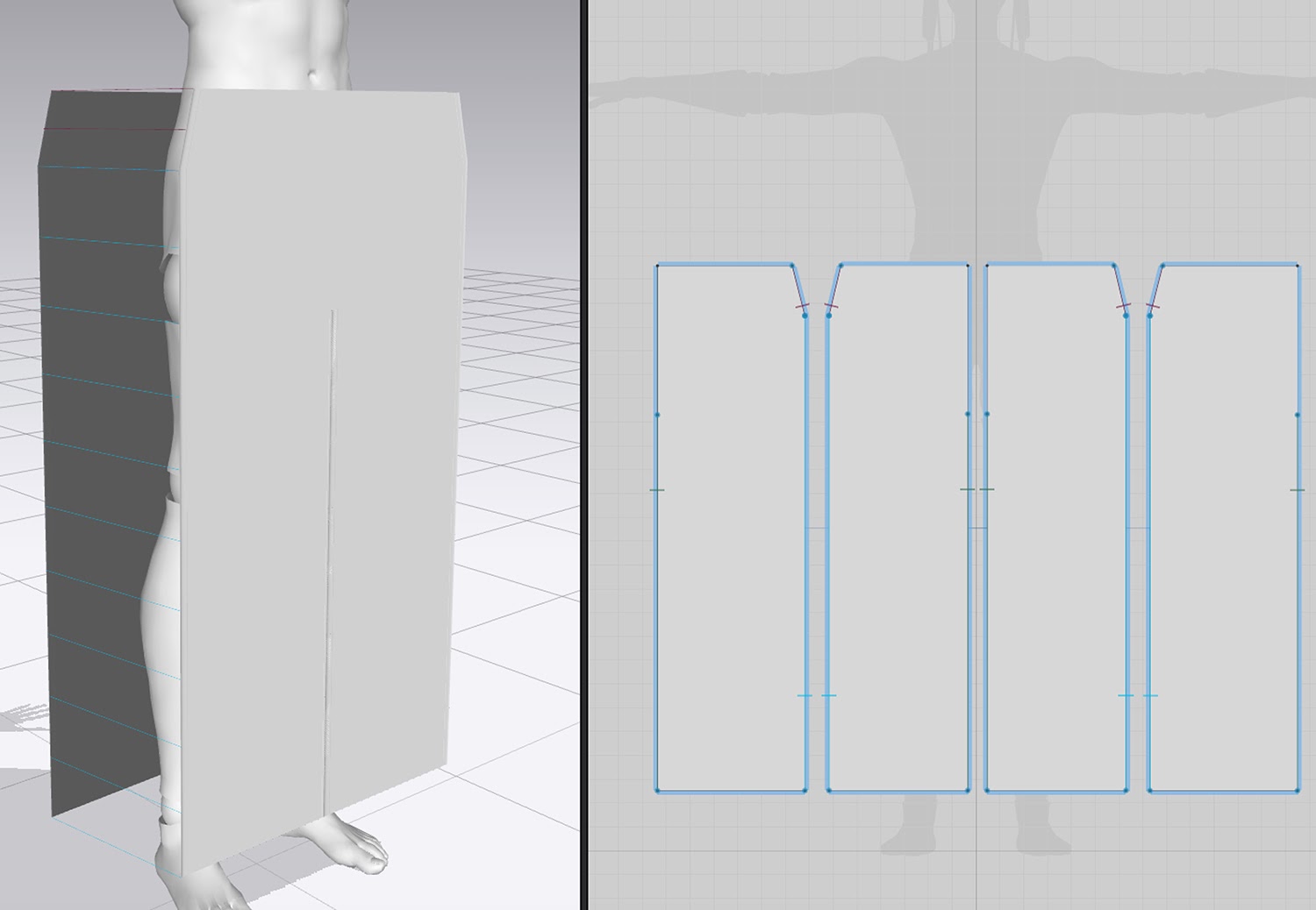 すると腿の外側と内側が同じ位置で縫われた状態で複製できる。あとは真ん中の腹と尻部分の縫い目を左右でつなぎあわせれば基本形が完成。