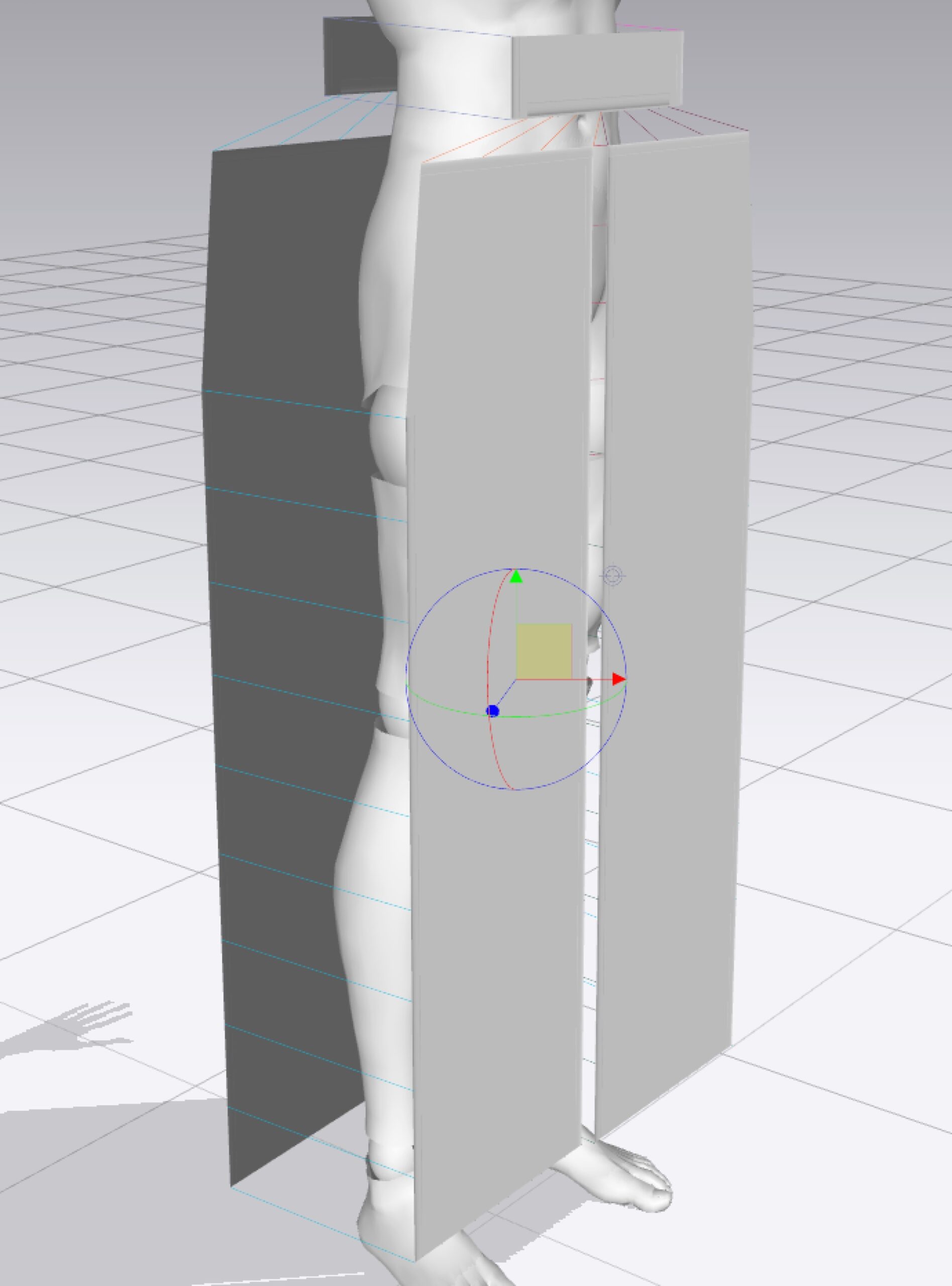 これで3Dウィンドウの左上の「シュミレーション」ボタンをおせばクロスシュミレーションがはじまり、縫い合わせられて重力に従って位置が調整されてアバターにフィットしていく。