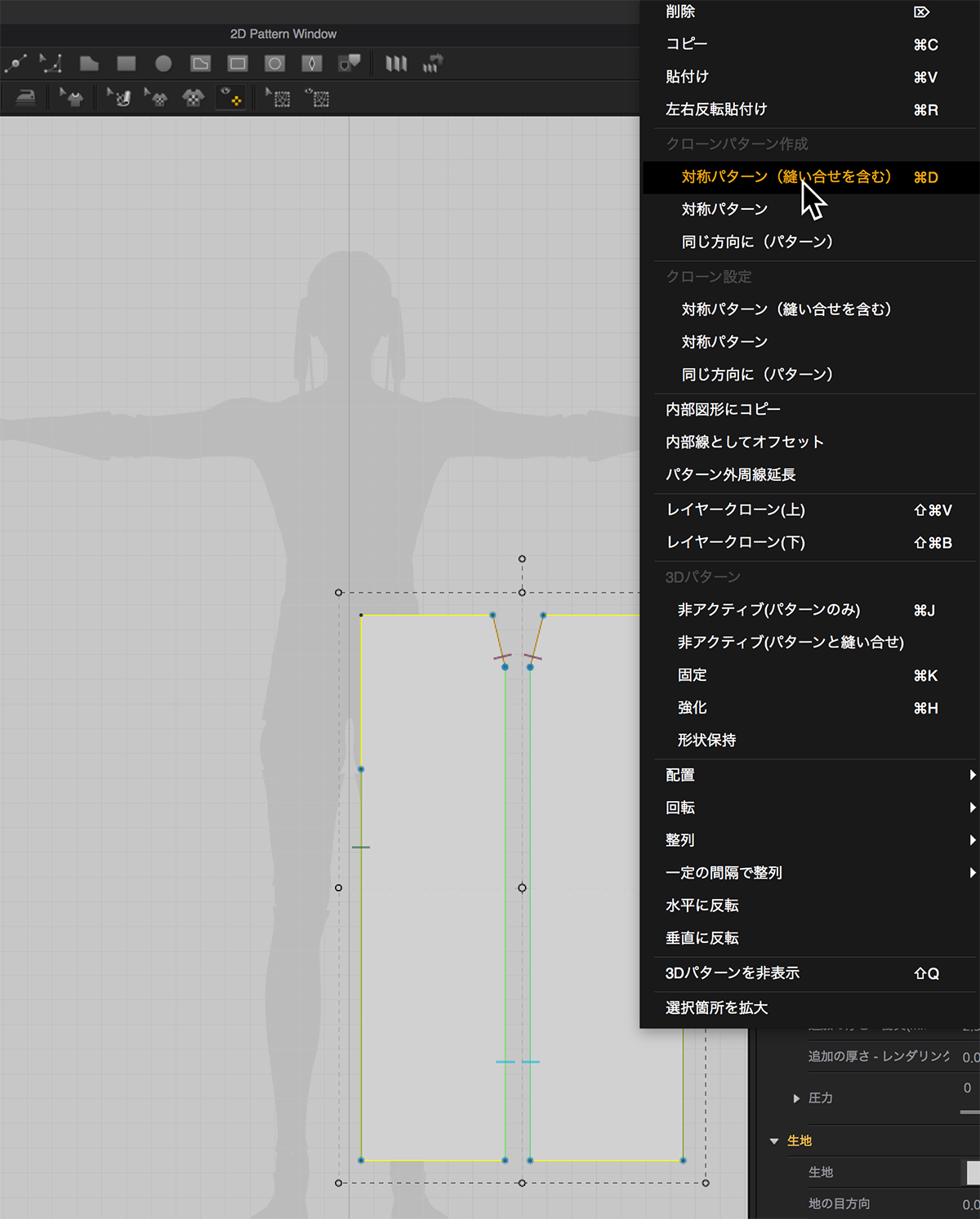 同じ形でこの状態を反対側にコピーするには、右クリックメニューでクローン状態を切ってから「対称パターン(縫い合わせを含む)」で反対側にコピペする。