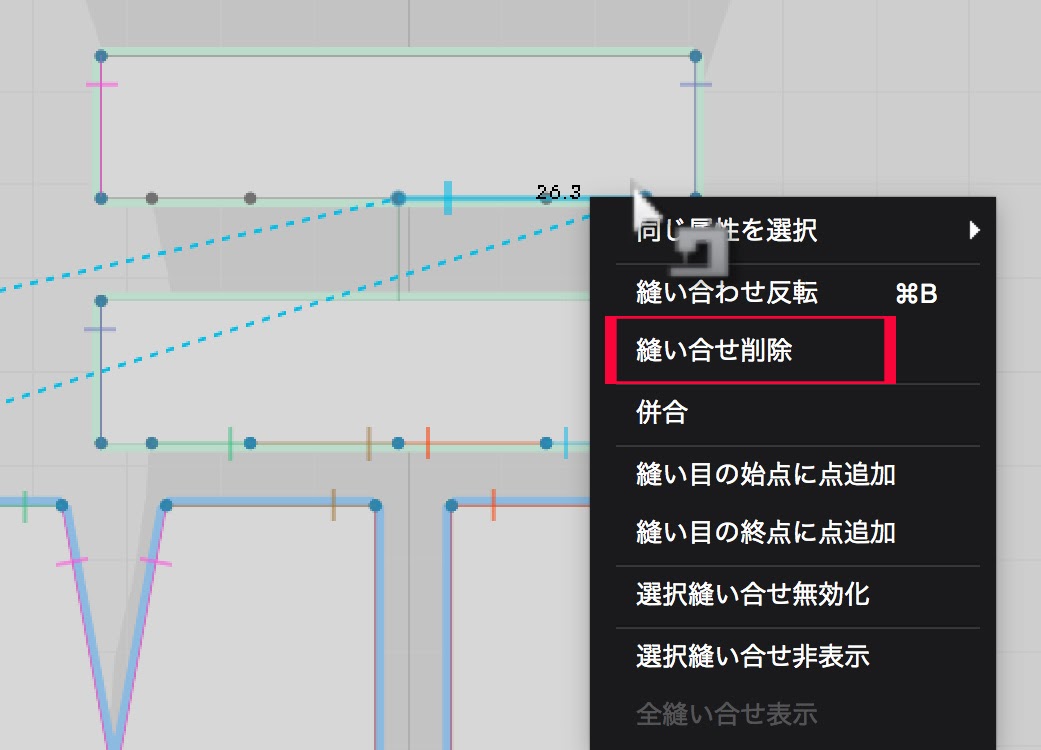 縫い目をほどくには、2Dパターンウィンドウのミシンマークの「縫い合わせ編集」で、目当ての縫い目の上で右クリックで「縫い合わせ削除」。