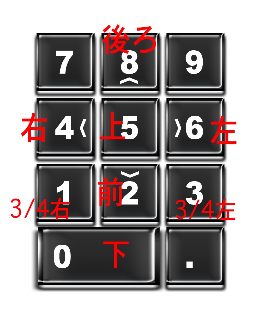 中央の5が真上からで上の8が後ろ、下の2が前、左右、斜め下などだいたい見た目通りなのでわかりやすい。(左右逆)