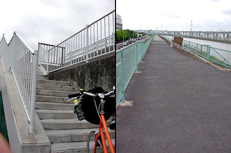 行き止まりにたちはだかるのは階段。川沿いから離れたらあがるとこ見過ごしそうだし。。。確認で階段をあがってみたら、土手にはちゃんと整備された道があるじゃないですか!