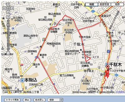 これがGooglemapを利用して表示できるのだが、HTML形式で保存すると、「トラックの再生」という機能がついてきて、走った通りに動画のように再生される。