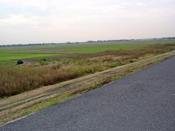 と、勇んであがっていくも、サイクリングロードには違いないが、まだ川ではなく田んぼの真ん中に伸びる道でした。