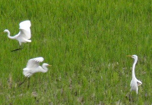 田んぼの中には多数の白鷺たちが舞い降りて遊んでいたり