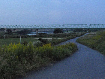ようやく今日の第一目標につきあたった時にはすでに太陽はなし。うう、今からだと間違いなくまた「街灯のないまっくらサイクリングロード」になるのだが、とにかく川沿いに下れば家には帰れるはずだ!