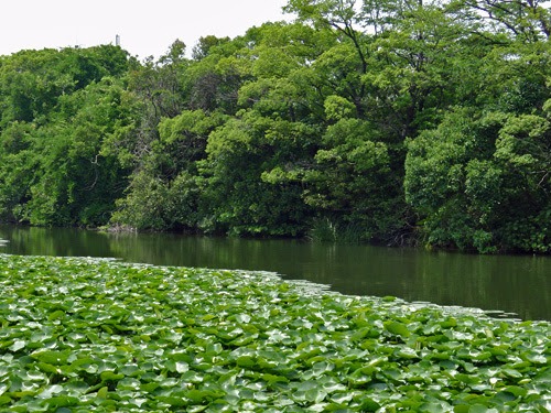とにかくいたるところで釣り糸をたらしていて、こんな蓮の密生地帯の中へも釣り竿を振る姿がみられます。なにげにつりの名所??