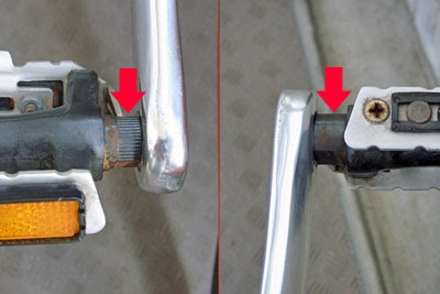 また、以前から何度も取り外しに挑戦しては、びくとも動かないペダルなんだが、見たら左右でちょっと違う。ここはデフォルトのままだったが、片方に溝がないのはなんで?