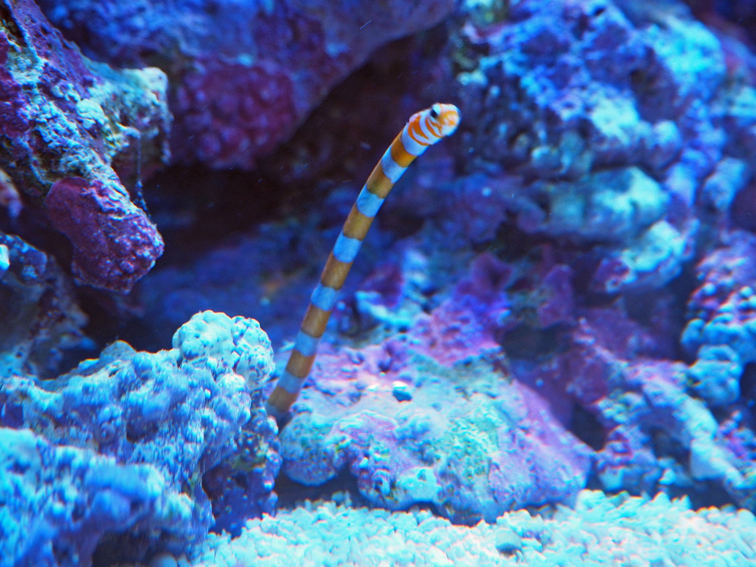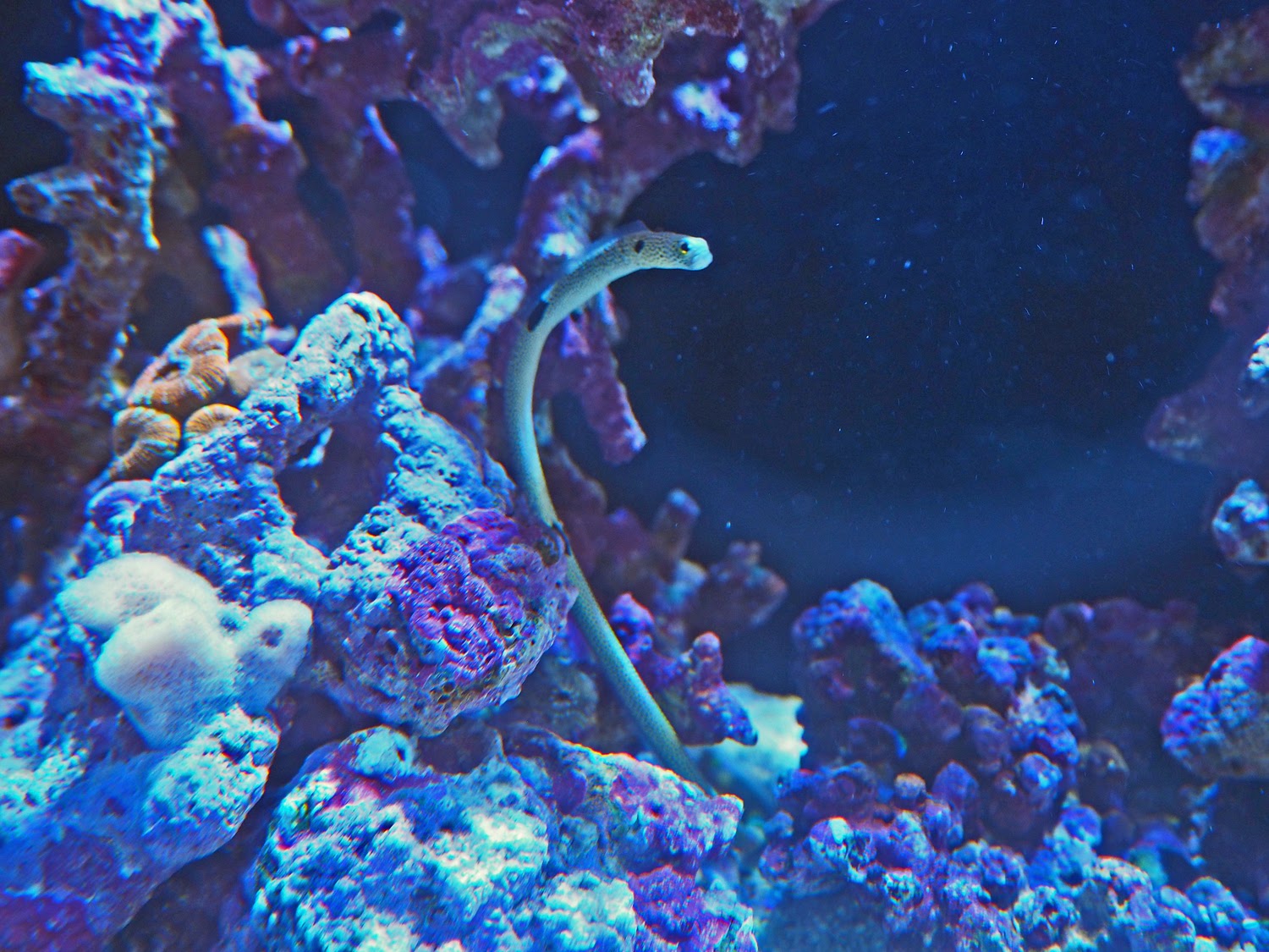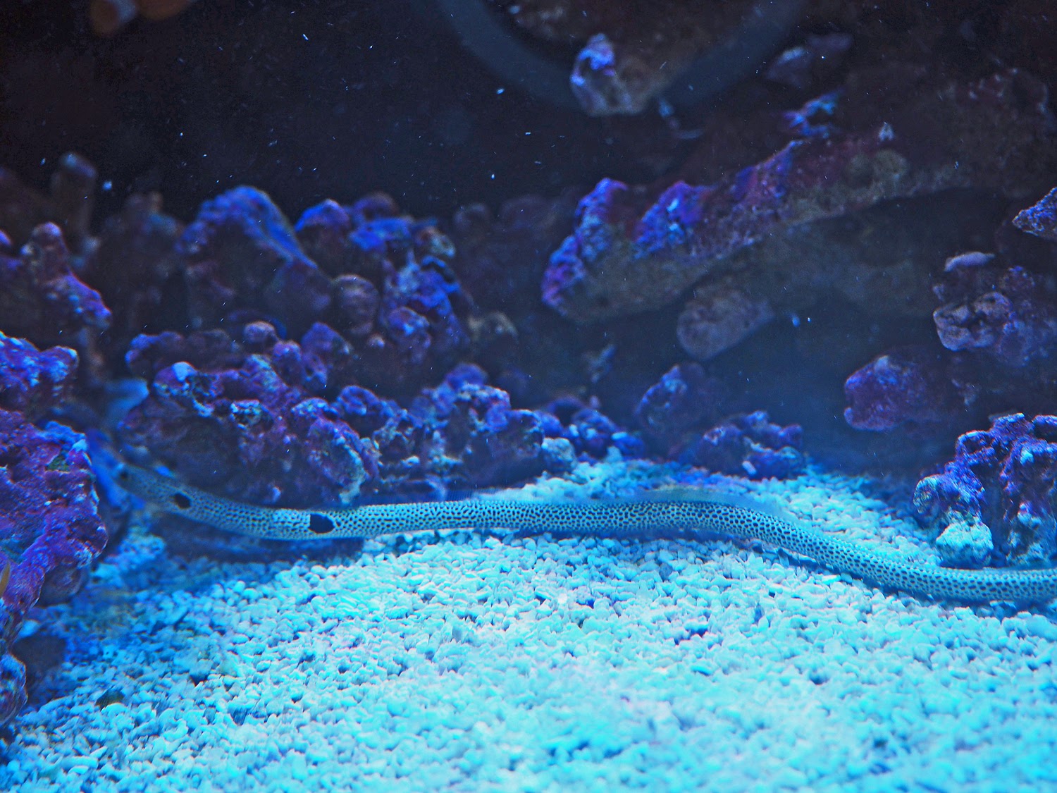 砂に潜ったわけではなく、ライブロックの岩の隙間に体を潜り込ませてるだけ。逆側から尾がでちゃったりしてるのだが、そこで良いのか??
