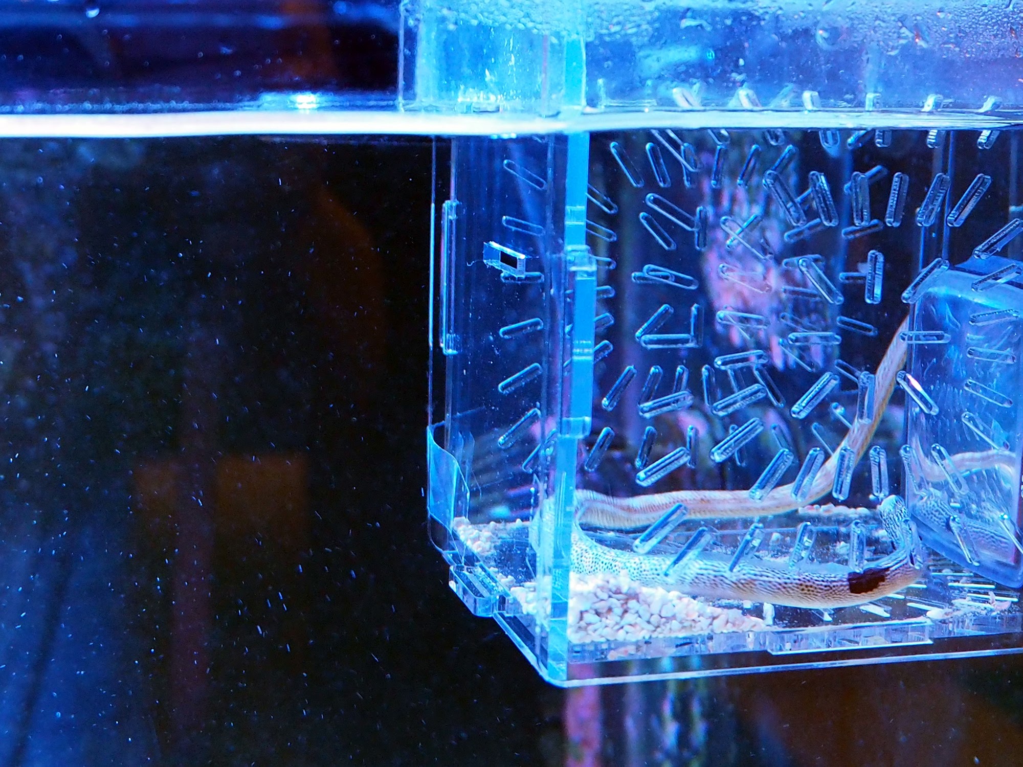 ギンポのように体をつついていじめる魚もないようなので、弱ってないなら放っておこうと思ったが、餌をやる時間になると、こいつの周囲に落ちた餌を拾おうとカエルウオなどが直接ではないが頭の周囲や体の周囲の砂をつついて落ち着かないのと、やはり動きが鈍いので再隔離。