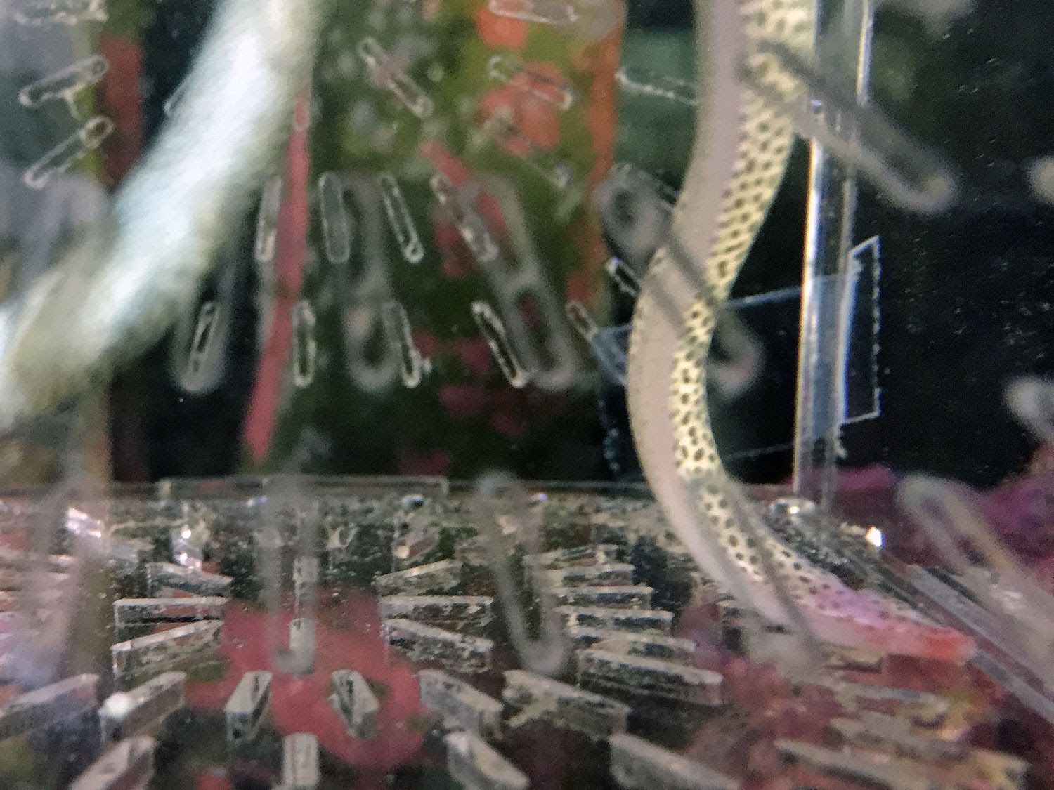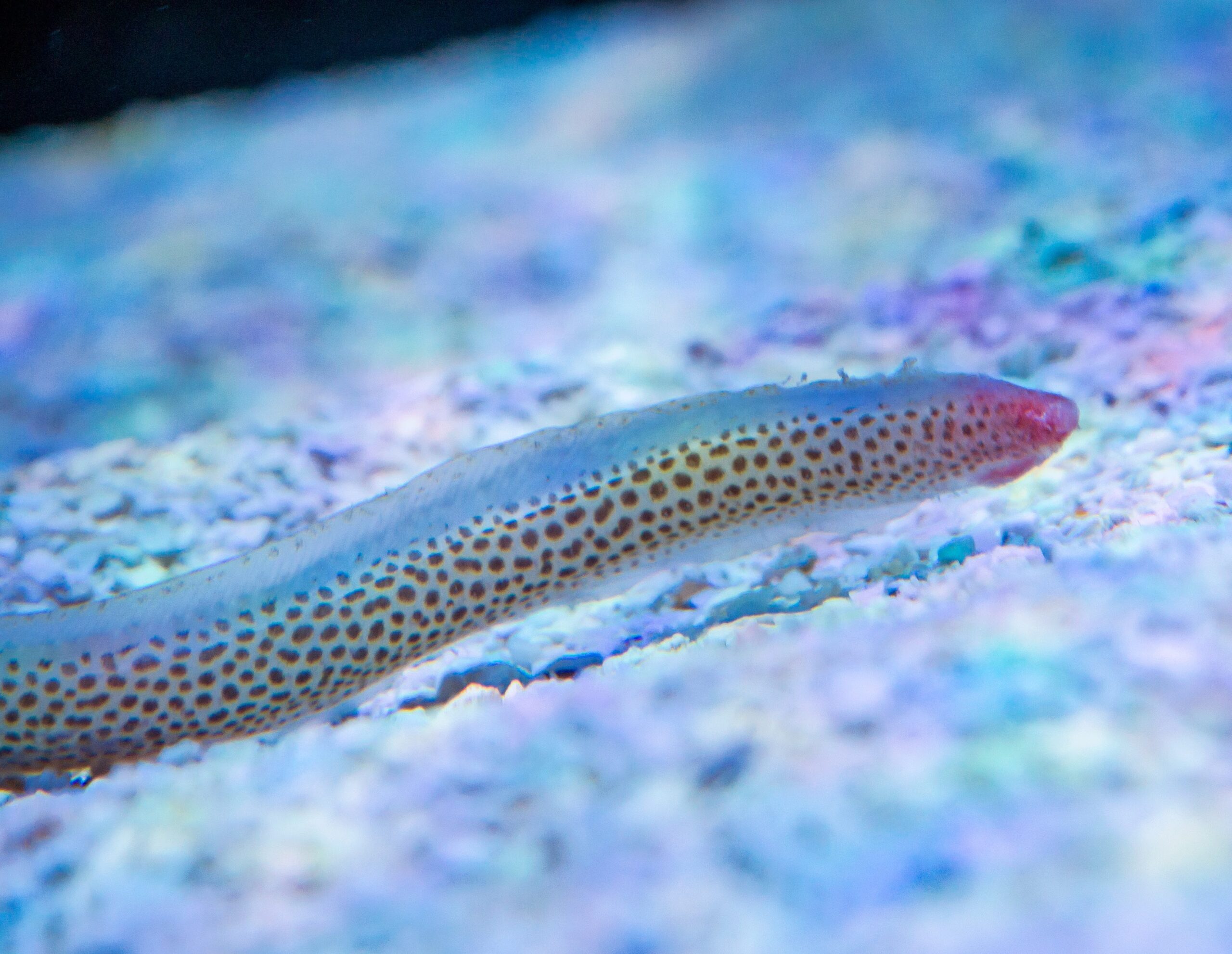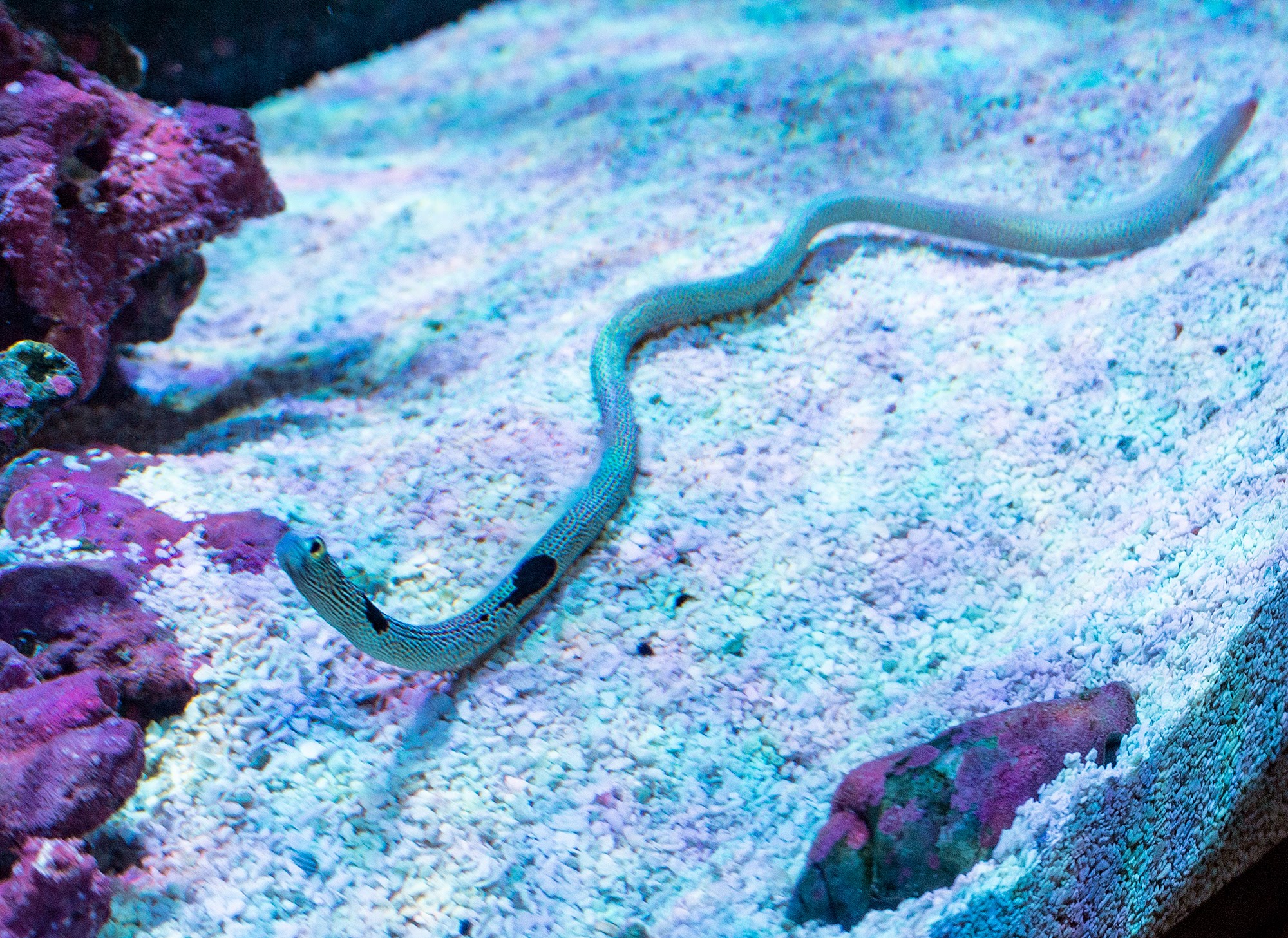 何もなけりゃ良いが、実際ライブロックが複雑に積み上げられてる方にいけば、水流に流されてごつごつの岩に叩きつけられたり、思いっきりサンゴに密着したり(炎症とか起こすかも?)、体が長いからこそ皮膚にダメージを与える確率が高い。