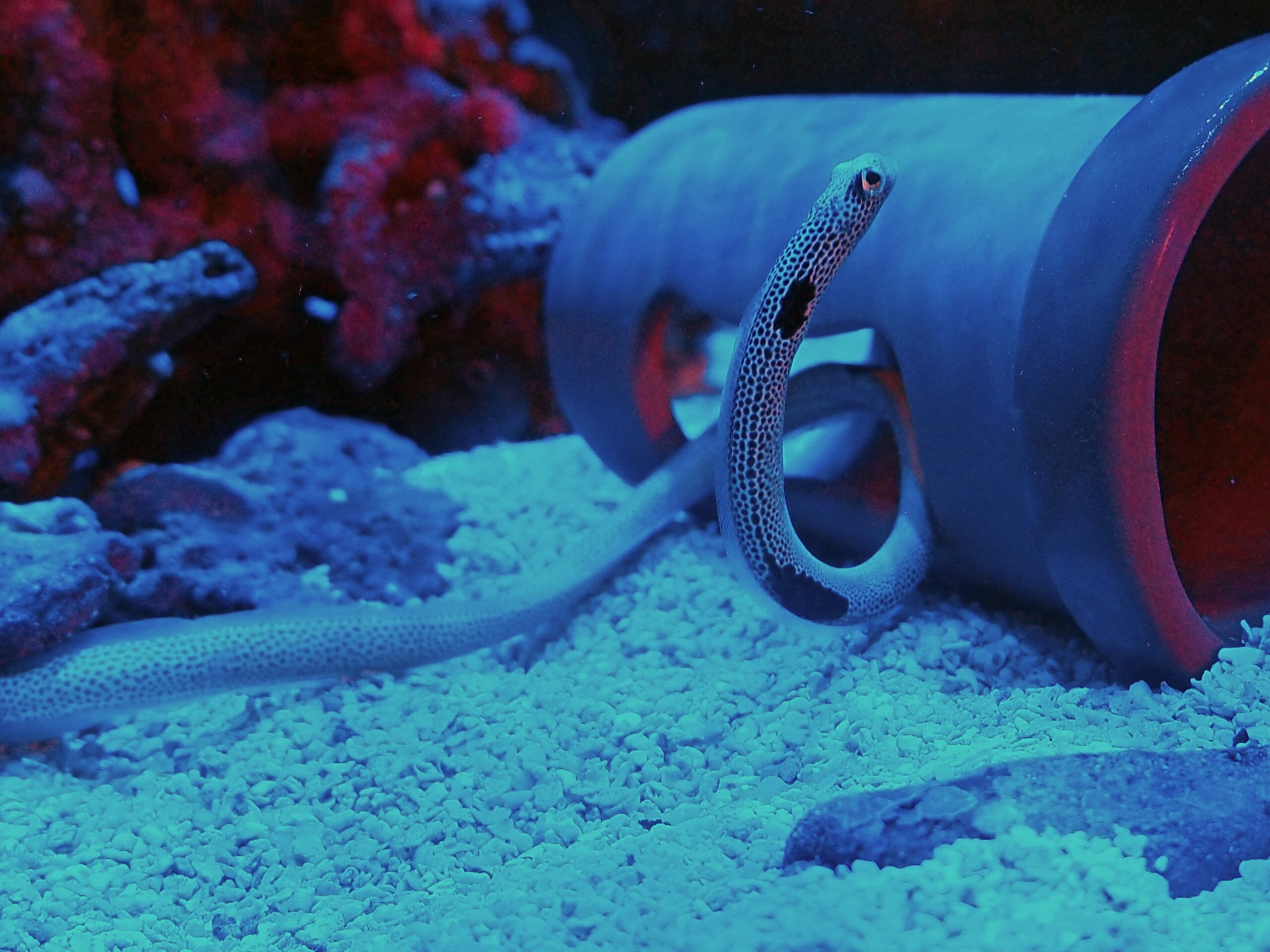 なんども捕まえて押し込む方がストレスかかりそうだったので、水流とチンアナゴが巡回するルートをよく観察して、よく流されて来たり止まる付近に土管を設置してあげた。