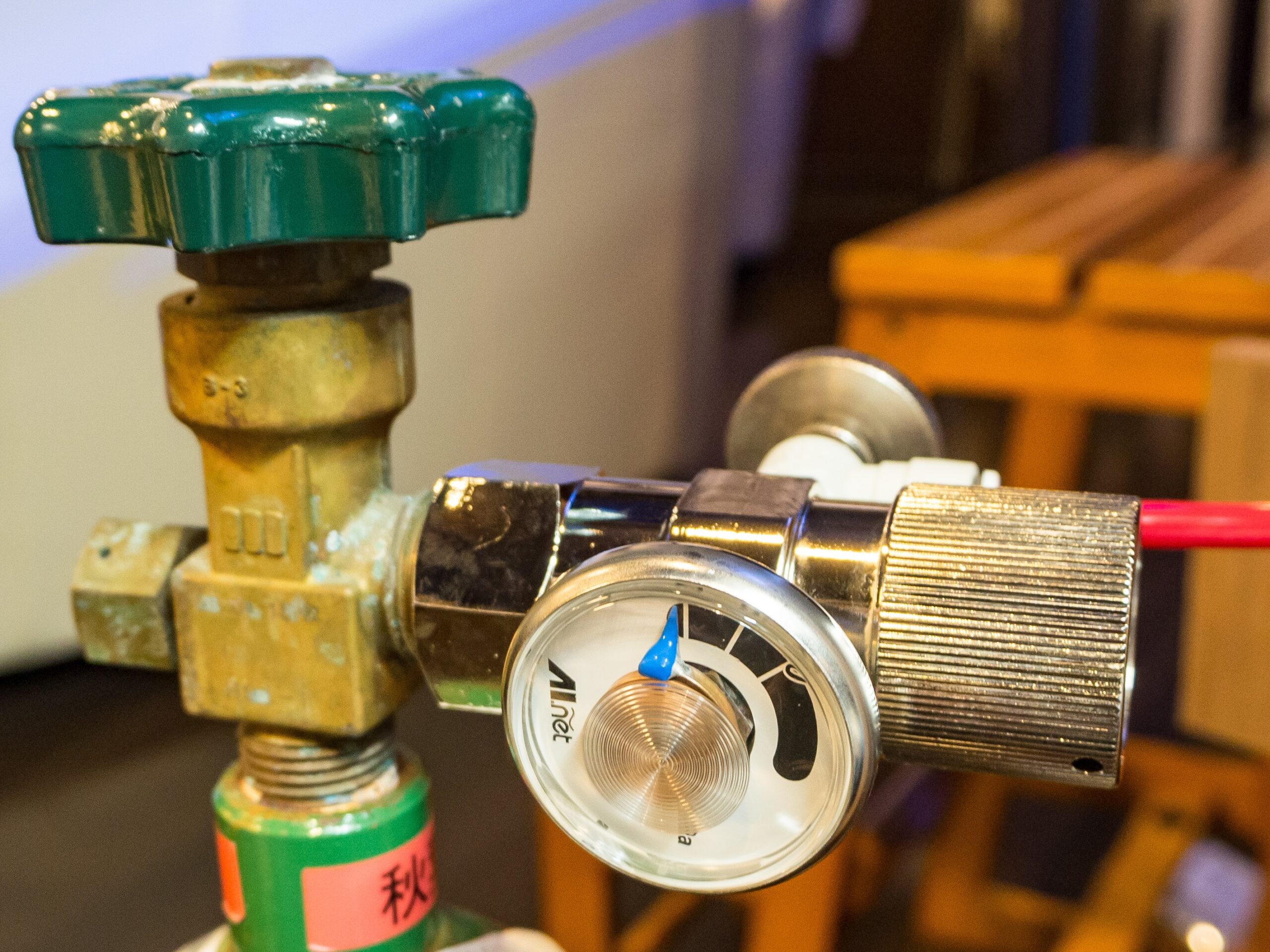 とりあえず手でまわるところまでググッと目いっぱい締め付けて、バルブをそっと開けたところ、レギュレーターの付け根の穴から「ぶぼっ!」と噴出した。
