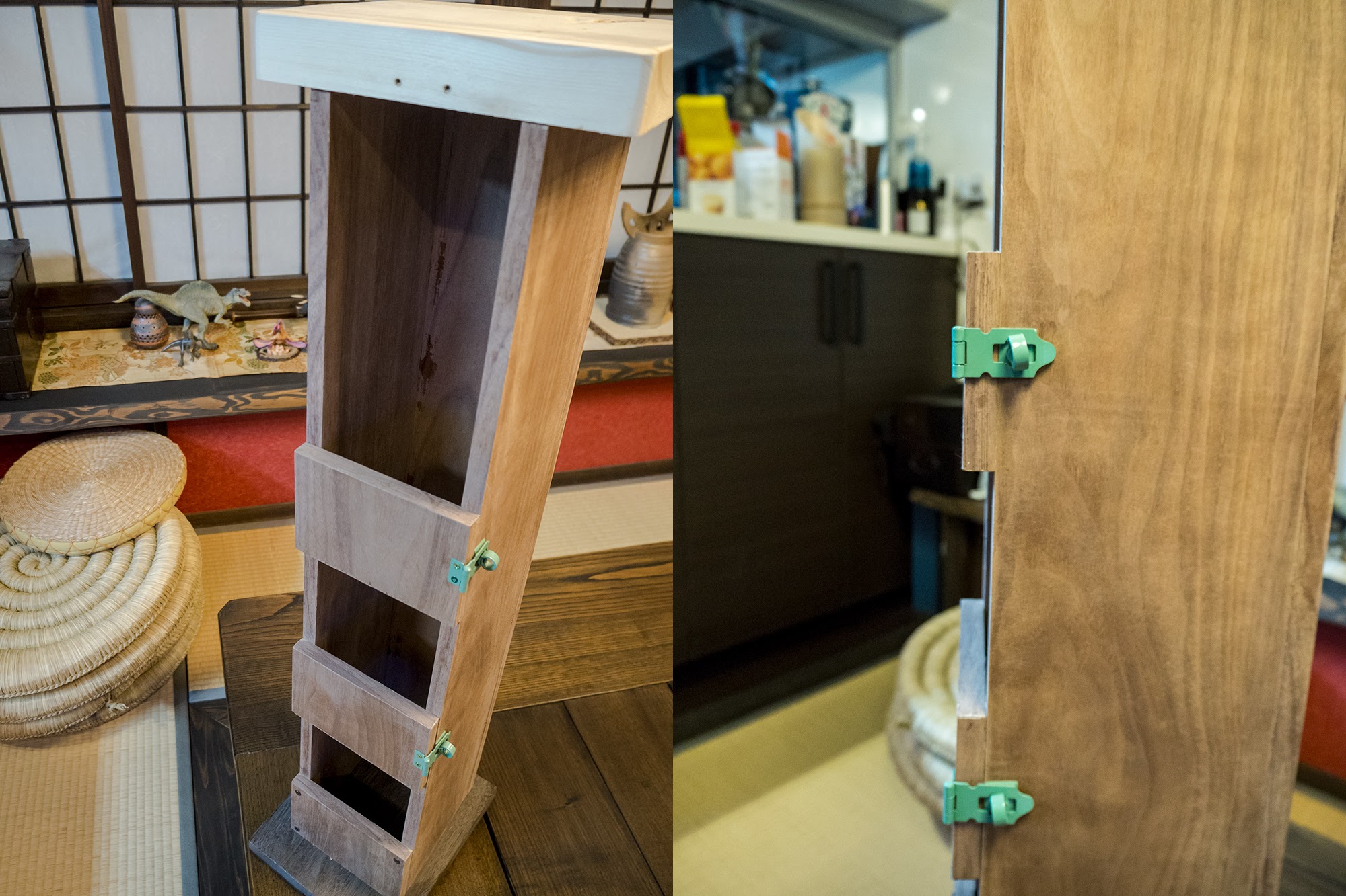 開き戸には掛け金つけて普段は固定する予定。底板の裏には滑り止めパッドを貼り付けた。