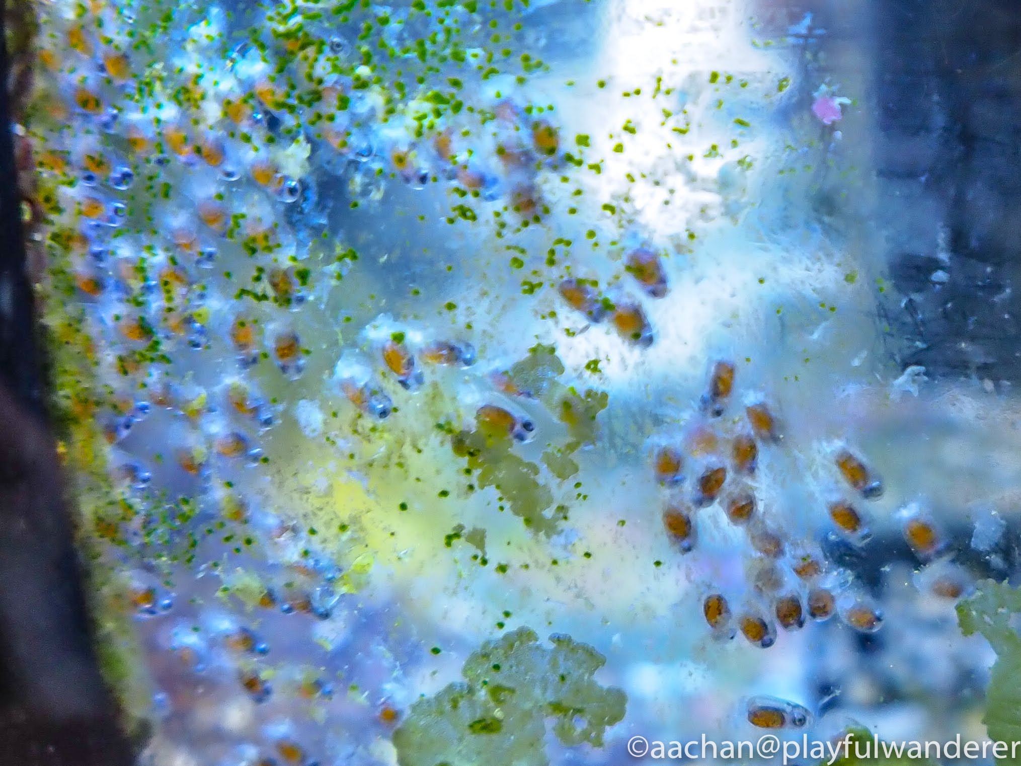 ただの苔だと思って気づかなかった。。。。本当だ〜〜〜〜〜!! びっちりとガラスに卵が産み付けられてた。目玉あるよ。