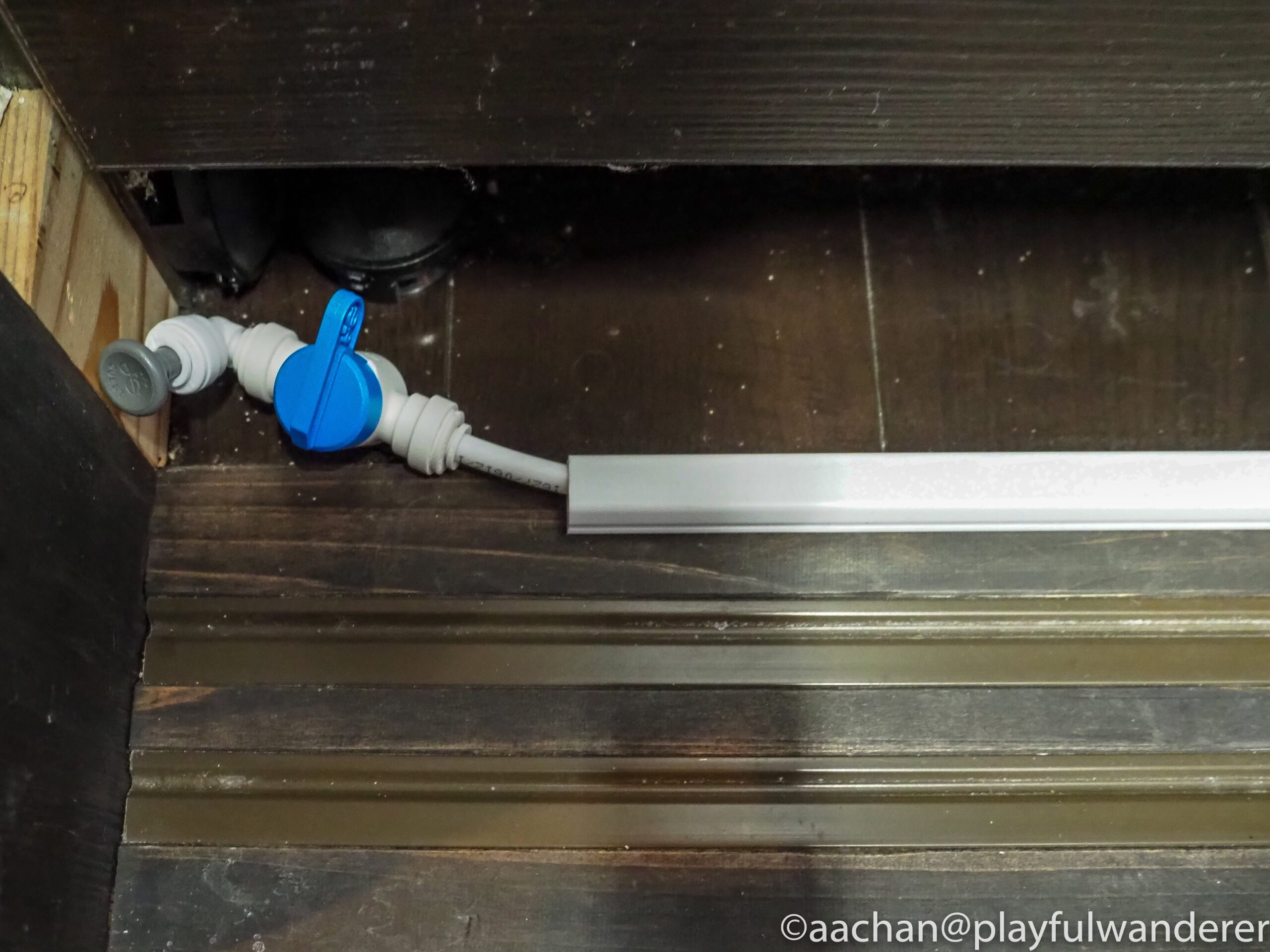 戸棚の中を這わせて水槽の近くに水栓をのばし、柱を挟んで裏側の水槽サンプにR.O.水を注げるように。