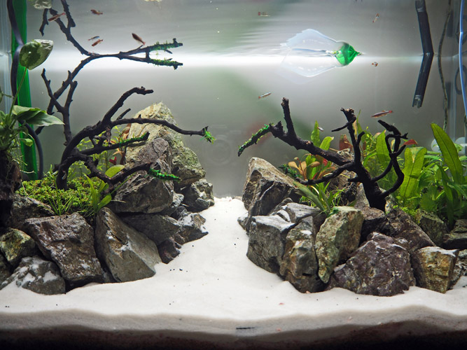 ちょっとこれから水草を買い足して、石で区切ったところで水草の種類を変えてもうちょい作っていくつもり。